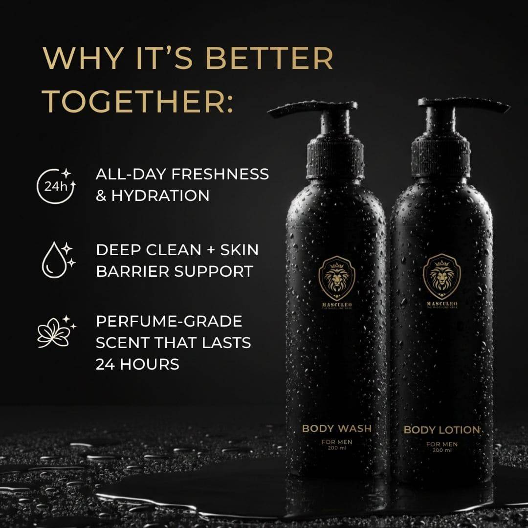 The Masculeo Duo brings together two essentials that elevate your grooming without complicating it. The Body Wash delivers a deep, refreshing cleanse that lasts beyond the shower, while the Body Lotion provides lightweight hydration with a composed, long-lasting scent. Designed to work together, the Duo keeps your skin clean, balanced, and confidently fresh throughout the day. It’s the complete routine for men who want to look, feel, and smell their best—without unnecessary steps.